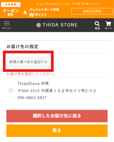 お届け先一覧画面で「新規お届け先を追加する」を押します。