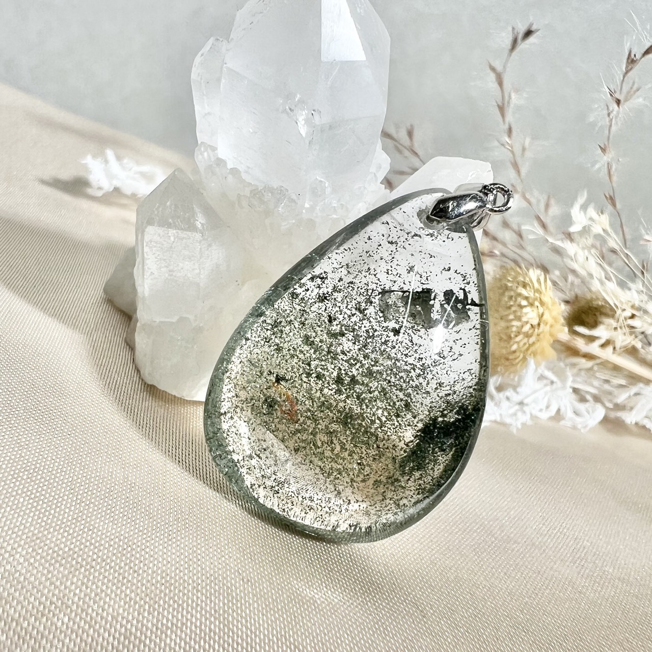 ガーデンクォーツは、水晶の中に苔や庭園のような内包物を含むことからその名がついた天然石。まるで小さな自然の世界が閉じ込められているかのような神秘的な見た目が特徴です。