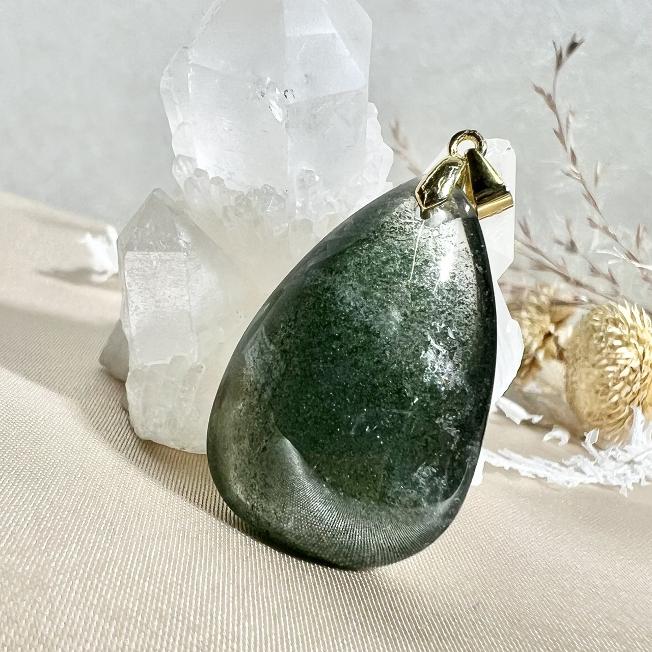 ガーデンクォーツは、水晶の中に苔や庭園のような内包物を含むことからその名がついた天然石。まるで小さな自然の世界が閉じ込められているかのような神秘的な見た目が特徴です。